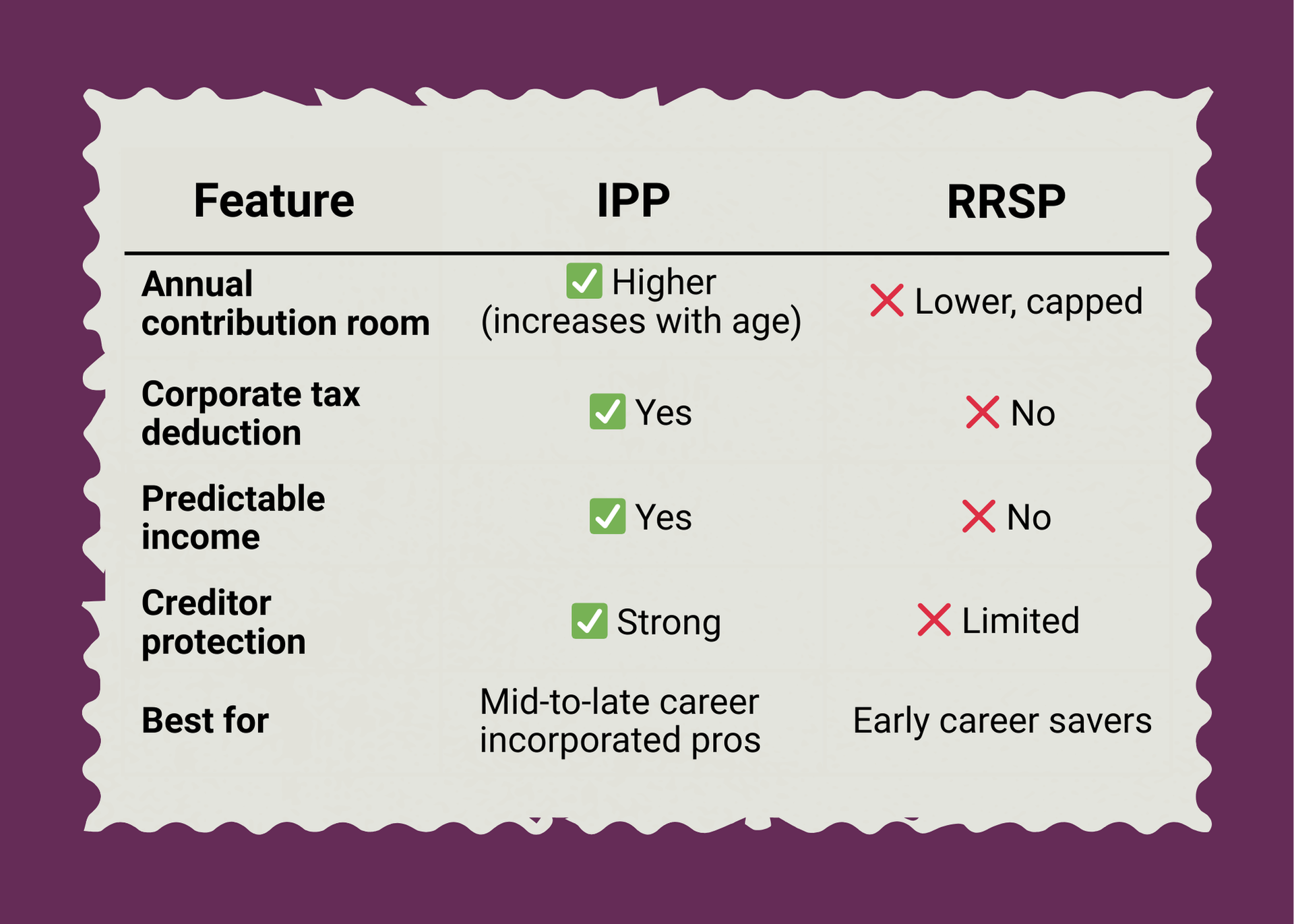 IPP vs RRSP decision comes down to how much control, contribution room, and tax efficiency you want. Here's a quick comparison to highlight the key differences and help you find the best fit: